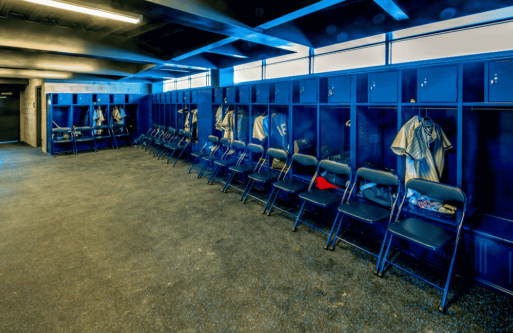 A clean, organized school locker room with rows of metal lockers and benches. The space is empty, highlighting the facilities student-athletes use and the importance of providing equal, well-maintained areas for all teams.