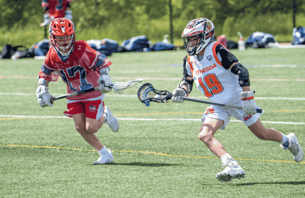High school lacrosse players in full gear sprint across a green field during practice, showcasing the sport’s growing popularity as part of a school’s expanding athletic program.