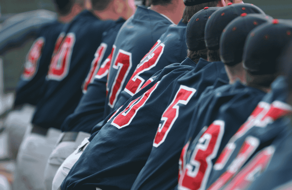 A group of baseball players sit closely together on the dugout bench, wearing uniforms and caps, watching the game with focus and camaraderie. The image conveys teamwork, concentration, and the shared experience of athletes supporting one another — reflecting the article’s theme of integrating sports psychology into athletic programs to strengthen both mental and physical performance.