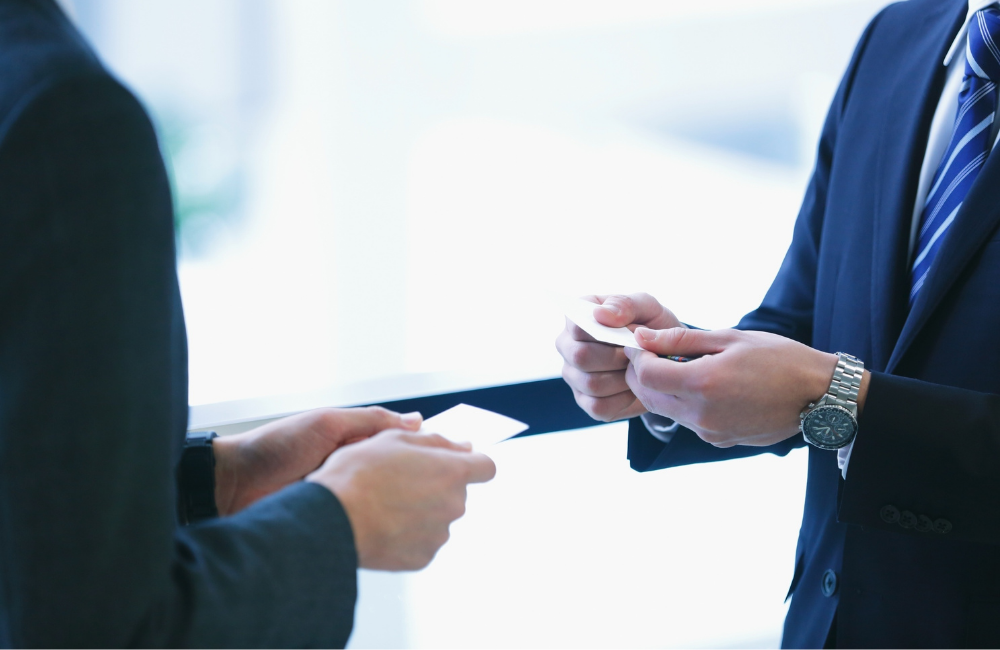 Two athletic directors shake hands and exchange contact information, symbolizing networking and professional collaboration in school sports leadership.
