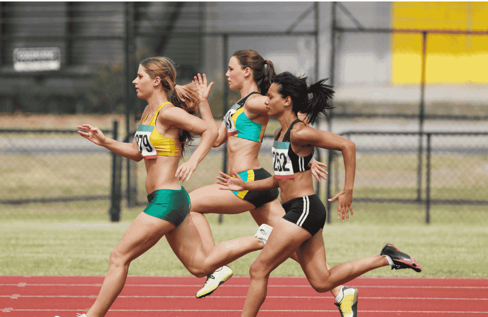 Female track athletes sprinting on an outdoor track, showcasing strength, speed, and competition. The image highlights women’s athleticism in the context of research on performance, injury prevention, and equity in sports.